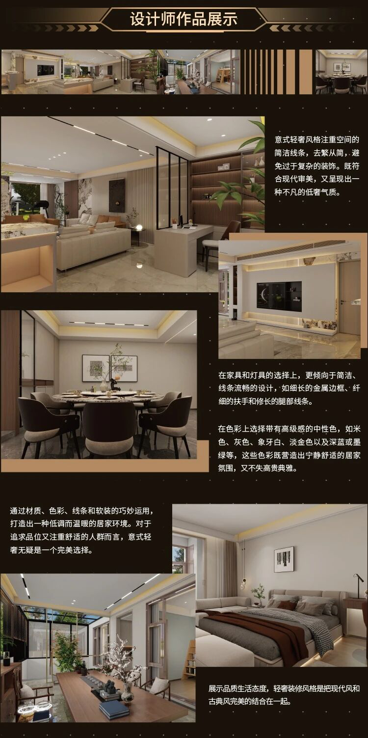 另外,出自设计师陈伯彪之手的意式轻奢大平层,则在开阔通透的格局中,蕴藏了精心规划的流动节奏与层次韵律:通过简洁流畅的线条设计,去繁从简,把现代风与古典风完美结合,营造出低调奢华的视觉感受;同时,巧妙运用材质、色彩和软装,打造出温暖而有质感的居家环境,为居住者营造出一方从容安定、可滋养身心的场域,彰显出归真生活的设计理念。