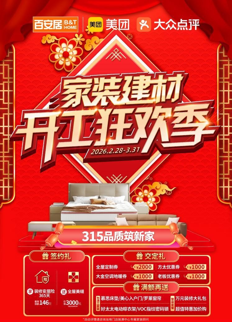 活动期间,成功签约百安居家装套餐即可享专属签约礼,不仅能拥有365天装修安居险,为家装全程保驾护航;缴纳定金可解锁丰厚交定礼,可领取各品类超千元优惠券,家装核心品类优惠一站配齐,轻松降低装修成本。超值特惠加价购等福利,让消费者花更少的钱,实现家居的焕新升级,享受更优质的家装体验与品质生活。