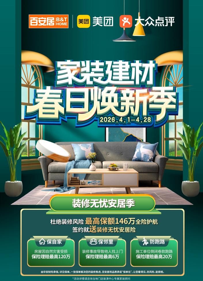 为让高品质家装进一步惠及千家万户,百安居重磅推出“家装建材春日焕新季”活动,购建材跨品类每满1000元至高立减200元优惠补贴,减轻焕新成本。与此同时,推出装修无忧安居险,最高保额可达146万,实现全险护航。百安居用“保自家”、“保邻里”、“防跑路”等全链路保险服务,解决消费者的装修焦虑,消除后顾之忧、杜绝装修风险,让消费者看得见、防风险、能索赔,真正做到惠民利民,让无忧家装触手可及。