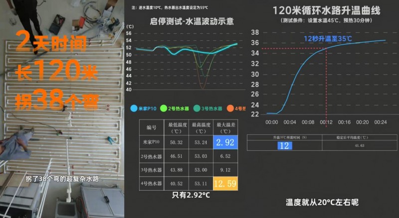 为验证米家P10热水器的“恒温”实力,「家电真探局」搭建了一条总长120米、内含38处直角弯的“魔鬼水路”,远超普通家庭40-80米的管道长度。在夏季通过加冰将进水温度控制在10℃,模拟严寒冬季工况。测试结果显示,在启停、超长水路出水等复杂场景下,该产品表现出色:关水1分钟后再开启,最大温差仅2.92度,120米处出水口首次出水从20度升温至35度仅需12秒。这种极限测试不仅还原了最严苛的使用场景,更直观地展示了产品性能。